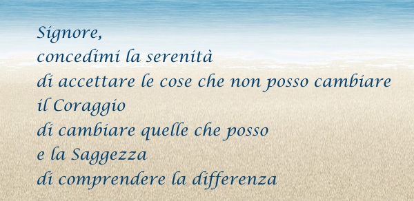 1. Questo post è proprio per me!Non sono una persona paziente ma cerco di non esplodere(magari perdo il controllo 1 o 2 volte all’anno),non accetto di non poter cambiare le cose,non sono cosi’ saggia da arrendermi e da comprendere quando è ora di lasciar andare certe situazioni.Un disastro insomma!Questa è la mia natura o il mio ego.Poi dopo lotte infinite,perdite di tempo,molto dolore e strategie varie,qualche volta mi ricordo che ogni evento mi deve insegnare la calma e la resa al Divino.E per un po’ tutto diventa semplice…fino alla prossima prova da affrontare.Ora sono al centro di un vortice di questo tipo,ma va bene cosi’…ce la posso fare ,anche se la mia tendenza all’arroganza e all’orgoglio è sempre latente.Grazie Aldo di questi nuovi spunti di riflessione Giò