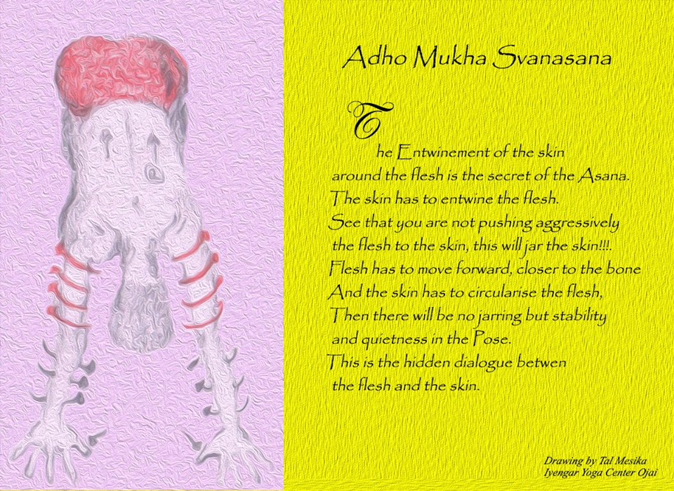 Parlare di Adho Mukha Svanasana richiederebbe almeno tre post molto lunghi, tanto è ricca di azioni complesse. Possiamo però riportare alla memoria il lavoro che va fatto sulle braccia, a patto che le gambe svolgano le azioni corrette. Come dice la frase nella figura, il segreto di una corretta azione nelle braccia è l’intrecciare (entwinement), l’attorcigliarsi, l’avvolgersi della pelle sopra i muscoli, nelle direzioni indicate dalle frecce. La pelle deve avvolgere la carne. Abbiate cura di non spingere aggressivamente la carne verso la pelle, questo scompaginerà la pelle! Pensate a quanta sensibilità dobbiamo ancora sviluppare per approfondire questo asana. E la pelle deve “circolarizzare” la carne (avvolgersi). Allora non ci sarà stridore nella posizione ma stabilità e calma. Questo è il dialogo nascosto, sottile tra la pelle e la carne. Buona pratica!