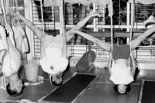 Per ottenere questo mi sono arrampicato su una scala e usai una corda legata ad un secchio per attingere l’acqua dai pozzi per praticare Shirshasana. Questa fu la soluzione. Avevo deciso che ogni qual volta che un istituto (centro di pratica) veniva costruito avrei messo degli anelli sul soffitto durante la costruzione stessa per appendervi le corde per Shirshasana, cosa che poi ho fatto quando l’istituto venne ultimato.”